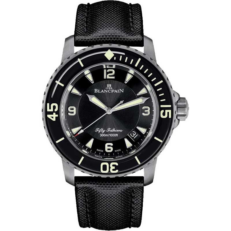 Blancpain Fifty Fathoms Automatic black Dial Mens Watch 5015-12b30-b52b. Grey titanium case with a black sail cloth (rubber backed) strap. Uni-directional rotating coin edge titanium bezel with a blue ceramic count-up elapsed time top ring. Black dial with luminous silver-tone hands and index hour markers. Arabic numerals mark the 3, 6, 9 and 12 o'clock positions. minute markers around the outer rim. Luminescent hands and markers. Date display between the 4 and 5 o'clock positions. Blancpain Calibre 1315 Automatic movement, containing 35 Jewels, composed of 227 parts, and has a power reserve of approximately 120 hours. Scratch resistant sapphire crystal. Screw down crown. Transparent case back. Round case shape, case size: 45 mm, case thickness: 15.40 mm. Band width: 23 mm. Tang clasp. Water resistant at 300 meters / 1000 feet.