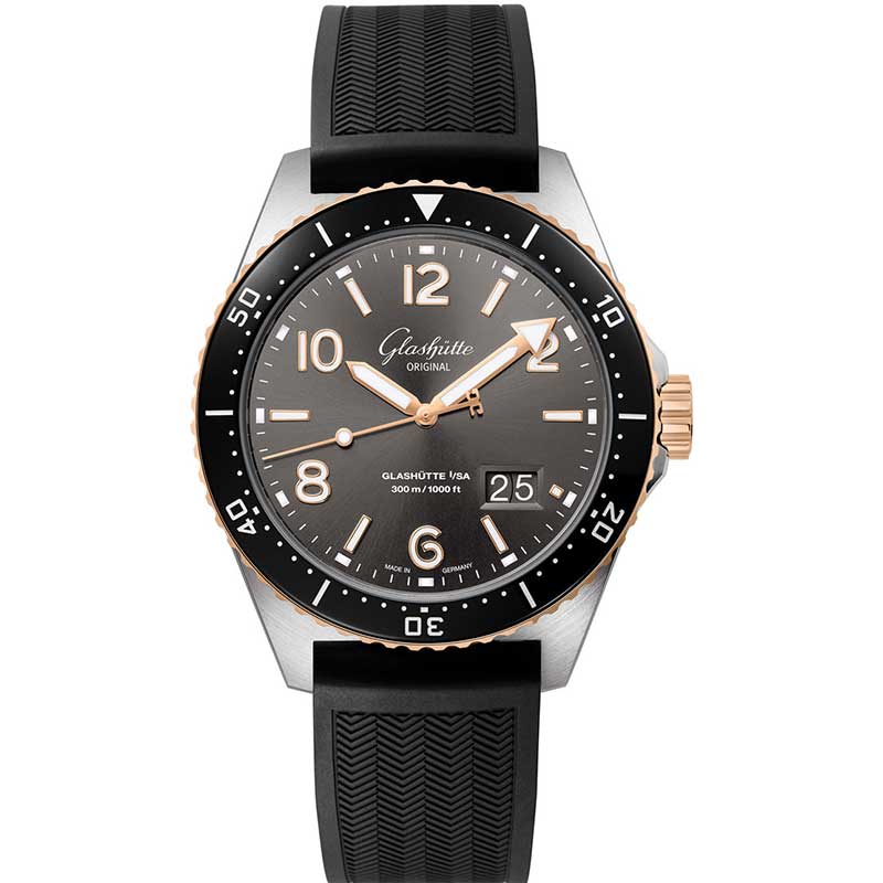 Glashutte Original 1-36-13-04-91-06 SeaQ Panorama Date 43.2mm Mens Watch. The watch features a brushed and polished stainless steel & Rose Gold case, complemented by a gray dial with a sunray finish. The polished hands and applied hour markers are filled with luminous material for easy readability in low light. A fine printed minute/seconds track runs along the outer edge of the dial, while a panorama date window is located at 4 o'clock. Powered by the Glashutte Original caliber 36-13, this timepiece beats at 28,800 vph, contains 41 jewels, and boasts an impressive power reserve of approximately 100 hours.