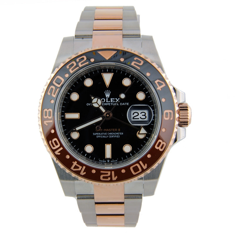 Rolex GMT-Master II Automatic Mens Steel and 18kt Everose Gold Oyster Watch 126711BKSO. Stainless steel case with a stainless steel Rolex oyster bracelet with 18kt everose gold center links. Bi-directional rotating 18kt everose gold bezel with a black and brown top ring. Black dial with luminous everose gold hands and dot hour markers. Minute markers around the outer rim. Dial Type: Analog. Luminescent hands and markers. Date display at the 3 o'clock position. Rolex calibre 3285 automatic movement with a 70-hour power reserve. Scratch resistant sapphire crystal. Screw down crown. Solid case back. Round case shape. Case size: 40 mm. Oysterlock clasp. Water resistant at 100 meters / 330 feet. Functions: date, hour, minute, second, 24 hours, GMT.