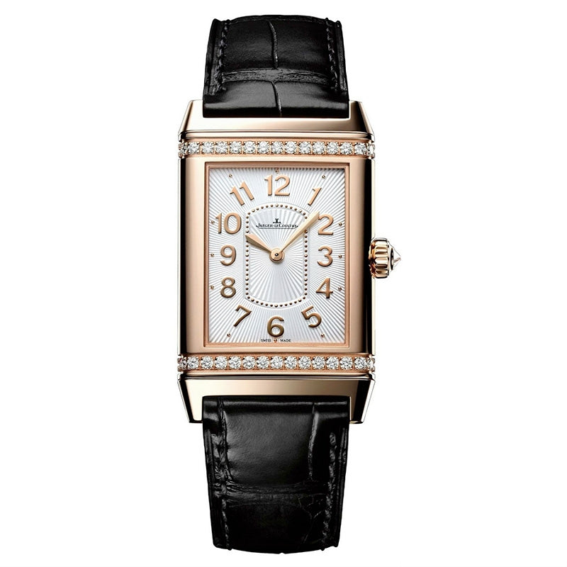 Jaeger LeCoultre Grande Reverso Silver Dial 18kt Rose Gold Black Leather Ladies Watch Q3202421. 18kt rose gold case with a black (alligator) leather strap. Fixed 18kt rose gold bezel set with diamonds. Silver dial with rose gold-tone hands and Arabic numeral hour markers. Minute markers around an inner ring. Jaeger LeCoultre calibre JLC 846 hand wind movement with a 40-hour power reserve. Scratch resistant sapphire crystal. Pull / push crown. Solid case back. Rectangle case shape. Case dimensions: 40 mm x 24 mm. Case thickness: 7.2 mm. Fold over clasp. Water resistant at 30 meters / 100 feet. Item Variations: Q3202421, 3202421, 320.24.21, Q320.24.21.