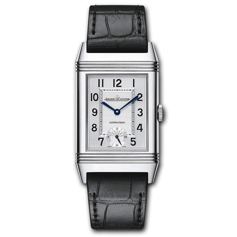 Jaeger Lecoultre Grande Reverso Automatic White Dial Black Leather Mens Watch Q3808420. Stainless steel case with a black crocodile leather strap. Fixed stainless steel bezel. White clous de paris dial with blue hands and Arabic numeral hour markers. Minute markers around an inner ring. Automatic movement with a 42 hour power reserve. Scratch resistant sapphire crystal. Pull / push crown. Solid case back. Case dimensions: 27.4 mm x 46.8 mm. Case thickness: 9.1 mm. Rectangle case shape. Deployment clasp. Water resistant at 30 meters / 100 feet. Functions: hour, minute. Additional Info: this hand cannot be set separately from the main hour hand & thus cannot function as a second time-zone. Luxury watch style.