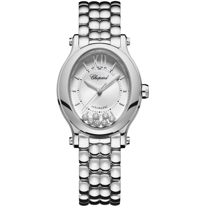 Chopard Happy Sport Oval Automatic Silver Dial Ladies Watch 278602-3002. Stainless steel case with a stainless steel strap. Fixed stainless steel bezel. Silver dial (with seven floating diamonds) with silver-tone hands and index hour markers. Roman numerals appear at the 6 and 12 o'clock positions. Minute markers around an inner ring. Chopard calibre 09.01-C automatic movement, containing 27 Jewels, bitting at 25200 vph, and has a power reserve of approximately 42 hours. Scratch resistant sapphire crystal. Pull / push crown. Transparent case back. Oval case shape. Case dimensions: 31 mm x 29 mm. Band width: 14 mm.