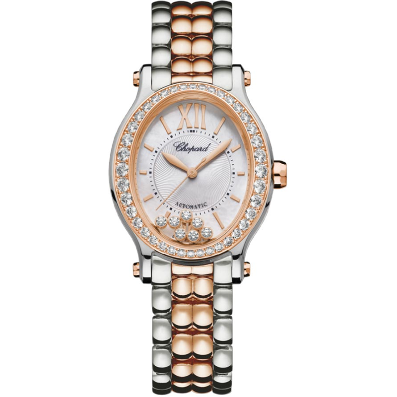 Chopard Happy Sport Automatic Diamond Silver Dial Ladies Watch 278602-6004. Stainless steel & rose gold case and bracelet. Fixed bezel with diamond set. Silver-tone with diamonds dial with silver-tone hands and Roman numeral,index hour markers. Chopard Calibre 09.01-C Automatic movement, containing 27 Jewels, bitting at 25200 vph, and has a power reserve of approximately 42 hours. Scratch resistant sapphire crystal. Pull / push crown. Transparent case back. Oval case shape, case size: 29 mm. Tang buckle clasp. Water resistant at 30 meters / 100 feet.