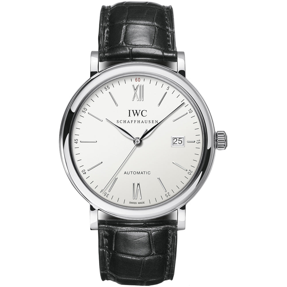 IWC IW356501 Portofino Automatic Silver Dial Men's Watch . Stainless steel case with a black crocodile leather strap. Fixed stainless steel bezel. Silver dial with silver-tone hands and index hour markers. Roman numerals mark the 6 and 12 o'clock positions. Minute markers around the outer rim. IWC calibre 35110 automatic movement with a 42-hour power reserve. Scratch resistant sapphire crystal. Pull / push crown. Solid case back. Case size: 40 mm. Case thickness: 9.5 mm. Round case shape. Band width: 20.3 mm. Band length: 8 inches. Tang clasp. Water resistant at 30 meters / 100 feet.