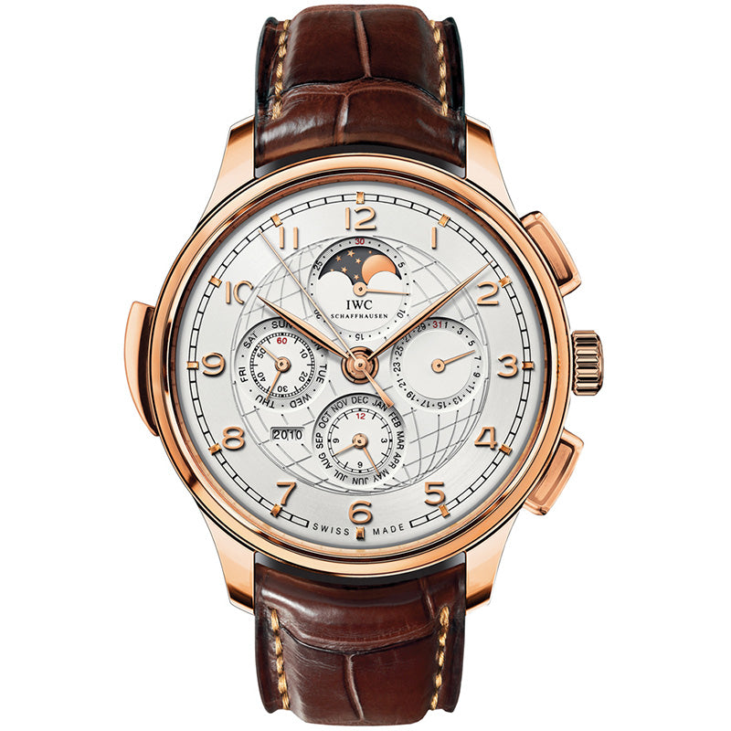 IWC Grande Complication Silver Dial 18k Rose Gold Brown Leather Automatic Mens Watch IW377402. 18kt rose gold case with a brown leather strap. Fixed bezel. Silver dial with gold-toned hands and Arabic hour markers. Minute markers around the outer rim. Automatic movement. Scratch resistant sapphire crystal. Pull / push crown. Case diameter: 45 mm. Case thickness: 16.5 mm. Round case shape. Deployment clasp. Water resistant at 30 meters / 100 feet. Functions: chronograph, date, hour, minute, second.