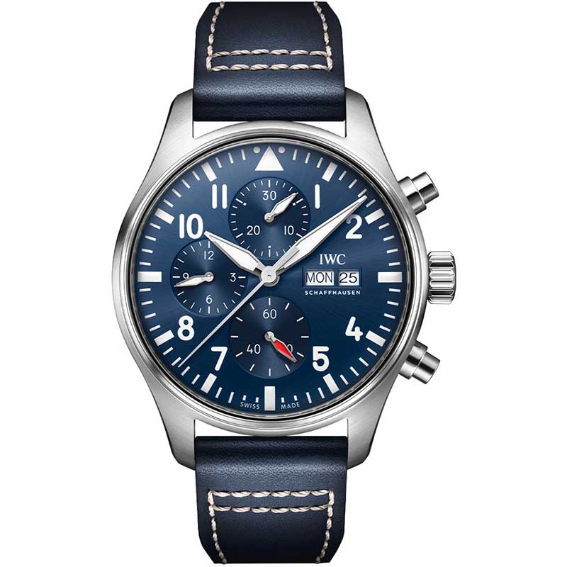 IWC Pilot Automatic Chronograph Men's 43mm Watch IW378003. This watch is designed with a sophisticated stainless steel case that combines brushed and polished finishes for a refined look. The blue sunray dial adds a vibrant touch, complemented by painted luminous markers for visibility in low-light conditions. The luminous hands further enhance readability, and a sub-dial at 6 o'clock tracks the seconds. A convenient date window is located at 3 o'clock. The watch is powered by the IWC Caliber 69385, which operates at 4Hz (28,800 vibrations per hour) and features 33 jewels, providing a power reserve of 46 hours (2 days). Its chronograph capabilities include a large central seconds counter hand, a 30-minute counter sub-dial at 12 o'clock, and a 12-hour counter sub-dial at 9 o'clock, making it a practical choice for both everyday wear and more specialized timing needs.