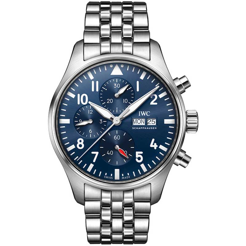 IWC Pilot Automatic Chronograph Men's 43mm Watch IW378004. This watch features a polished and brushed stainless steel case that offers a sleek, sophisticated look. The blue sunray dial adds depth and elegance, complemented by painted luminous markers that provide excellent visibility in low-light conditions. The watch includes luminous hands for enhanced readability, with a sub-dial at 6 o'clock dedicated to tracking the seconds. A convenient date window is situated at 3 o'clock. Powered by the IWC Caliber 69385, it operates at a frequency of 4Hz (28,800 vibrations per hour), contains 33 jewels, and boasts a power reserve of 46 hours (2 days). Its chronograph functions include a large central seconds counter hand, a 30-minute counter sub-dial at 12 o'clock, and a 12-hour counter sub-dial at 9 o'clock, making it a perfect blend of style and functionality for discerning watch enthusiasts.
