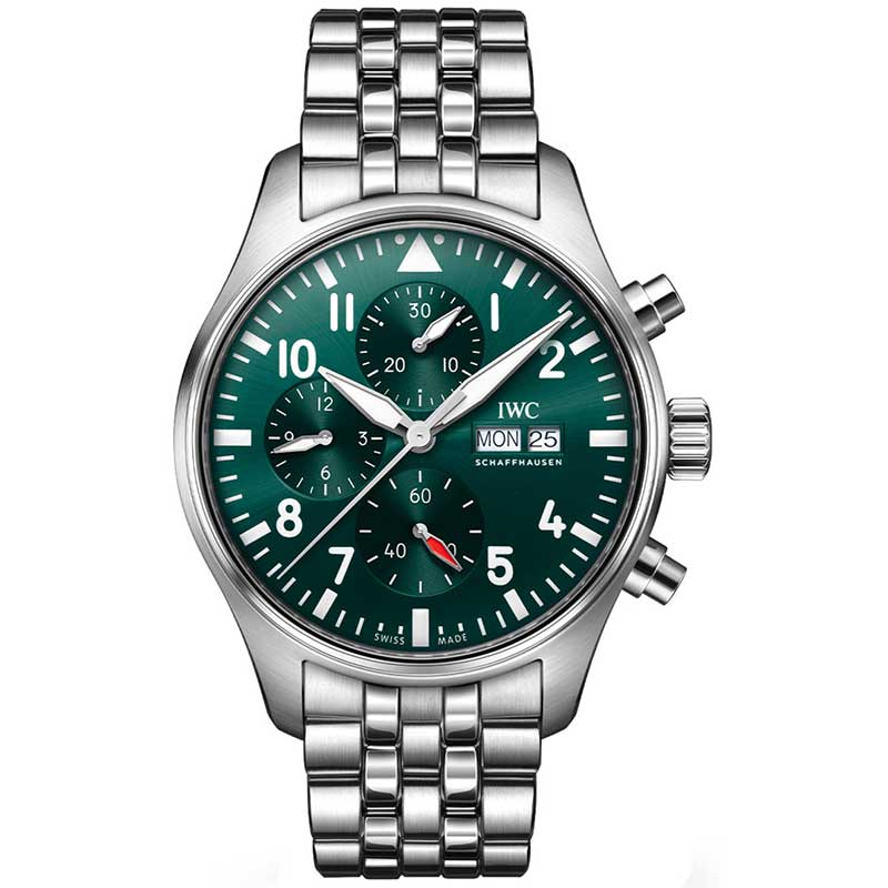IWC Pilot Automatic Chronograph Men's 43mm Watch IW378006. This watch features a polished and brushed stainless steel case that offers a sleek, sophisticated look. The green sunray dial adds depth and elegance, complemented by painted luminous markers that provide excellent visibility in low-light conditions. The watch includes luminous hands for enhanced readability, with a sub-dial at 6 o'clock dedicated to tracking the seconds. A convenient date window is situated at 3 o'clock. Powered by the IWC Caliber 69385, it operates at a frequency of 4Hz (28,800 vibrations per hour), contains 33 jewels, and boasts a power reserve of 46 hours (2 days). Its chronograph functions include a large central seconds counter hand, a 30-minute counter sub-dial at 12 o'clock, and a 12-hour counter sub-dial at 9 o'clock, making it a perfect blend of style and functionality for discerning watch enthusiasts.