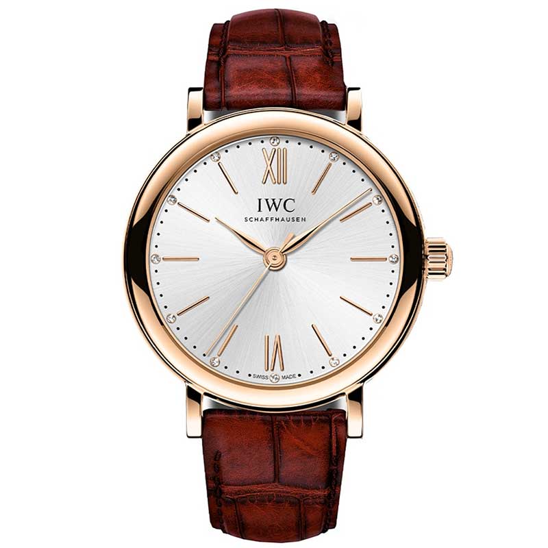 IWC Portofino Automatic 34 Ladies Watch iw357401. This exquisite watch features a polished 18kt rose gold case that radiates luxury, complemented by a dark brown alligator leather strap crafted by "Santoni," equipped with a convenient quick change system for effortless style adjustments. The silver dial enhances the sophisticated look, adorned with applied polished rose gold-toned index hour markers along with Roman numerals at 6 and 12, providing classic elegance. Twelve diamond hour markers add a touch of opulence, while the polished rose gold-toned hands ensure clarity and readability. Powered by the IWC Caliber 35100, this timepiece operates at a frequency of 28,800 vibrations per minute, contains 25 jewels, and boasts an approximate power reserve of 42 hours, making it a remarkable choice for watch enthusiasts who appreciate fine craftsmanship and design.