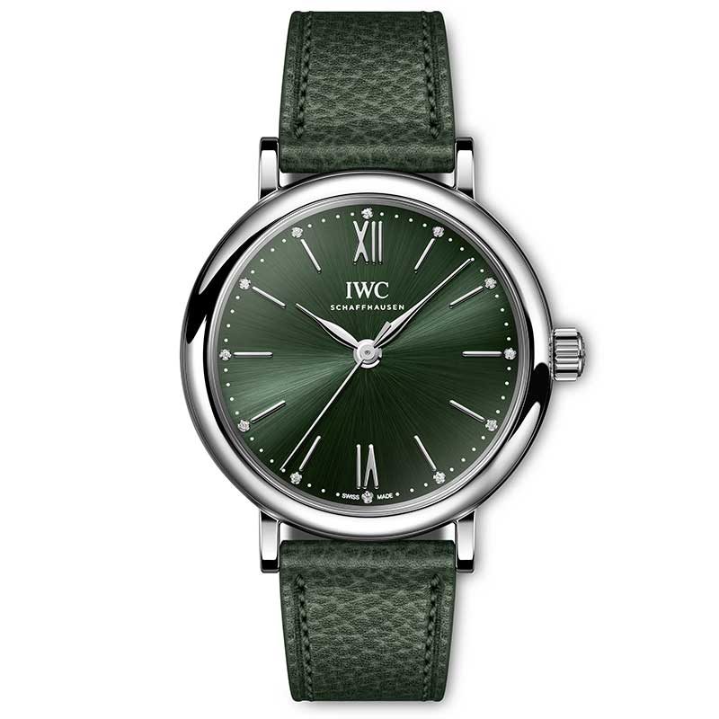 IWC Portofino Automatic 34 Ladies Watch IW357412. This elegant watch features a polished stainless steel case that exudes sophistication. The green sunray dial adds a luxurious touch, beautifully reflecting light with its radiant finish. The hour markers are applied and enhanced with 12 diamond dot hour markers, providing a stunning visual contrast and an opulent feel. The central large seconds hand offers a clear indication of time, further enhancing the watch's functionality. Powered by the IWC Caliber 35100, this timepiece operates at a frequency of 4Hz (28,800 vibrations per hour), contains 25 jewels, and boasts an impressive power reserve of 50 hours (2 days), making it both a stylish and practical choice for those who appreciate fine watchmaking.