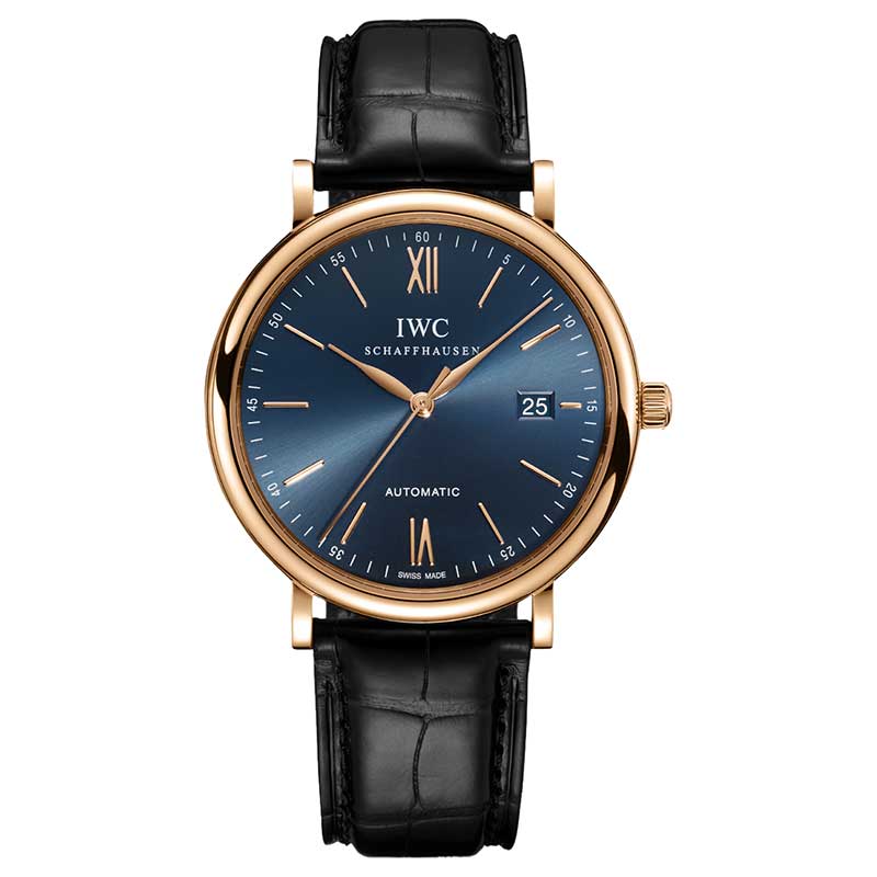 IWC Portofino Men's Watch IW356522. This stunning watch features a polished solid 18kt rose gold case that radiates luxury and sophistication. The eye-catching blue dial is beautifully complemented by applied polished rose gold hour markers, enhancing its elegant appearance. A fine printed minute and seconds track adds precision to the design, while polished rose gold hands provide clarity and style. A convenient date window is located at the 3 o'clock position for added functionality. The case back is intricately engraved, showcasing a picturesque view of the harbor at Portofino, adding a unique touch to the timepiece. Powered by the IWC Caliber 35111, this watch operates at a frequency of 28,800 vibrations per hour, contains 25 jewels, and offers an approximate power reserve of 42 hours, making it both a beautiful and reliable choice for watch enthusiasts.