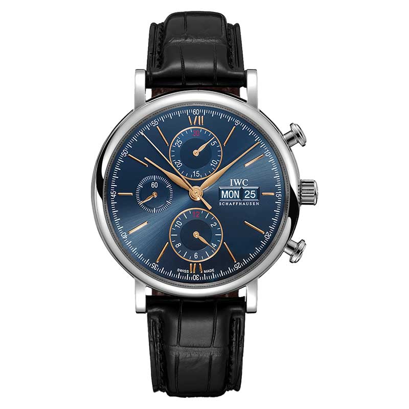IWC IW391036 Portofino Chronograph 42mm Men's Watch. This luxurious watch features a polished stainless steel case that exudes elegance, complemented by a striking blue dial. The dial is accented with applied polished rose gold hour markers, enhancing its sophisticated appearance. A fine printed track indicates minutes, seconds, and fractions of seconds, contributing to precise timekeeping. The polished rose gold hands not only provide a stunning contrast but also ensure clarity and readability. A convenient day and date window is displayed at the 3 o'clock position, while a small seconds sub-dial is located at 9 o'clock for additional functionality. The watch includes robust chronograph functions, featuring a large central seconds counter, a 30-minute sub-dial counter at 12 o'clock, and a 12-hour sub-dial counter at 6 o'clock. Powered by the IWC Caliber 75320, this timepiece operates at a frequency of 28,800 vibrations per hour, contains 25 jewels, and boasts an impressive power reserve of approximately 44 hours, making it a perfect blend of functionality and style for discerning watch enthusiasts.
