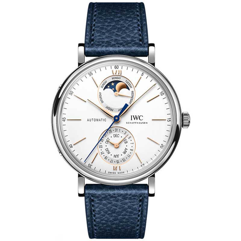 IWC IW359001 Portofino Complete Calendar 41mm Men's Watch. This elegant watch features a polished stainless steel case that exudes timeless sophistication. The matte silver dial offers a refined backdrop, enhanced by applied markers that ensure clarity and style. The central large seconds hand, crafted from blued steel, adds a striking contrast and easy readability. A date display is conveniently located in the sub-dial at 6 o'clock, combining practicality with aesthetic appeal. Powered by the IWC Caliber 32150, this timepiece operates at a frequency of 4Hz (28,800 vibrations per hour), contains 21 jewels, and boasts an impressive power reserve of 72 hours (3 days), making it a reliable choice for discerning watch enthusiasts.