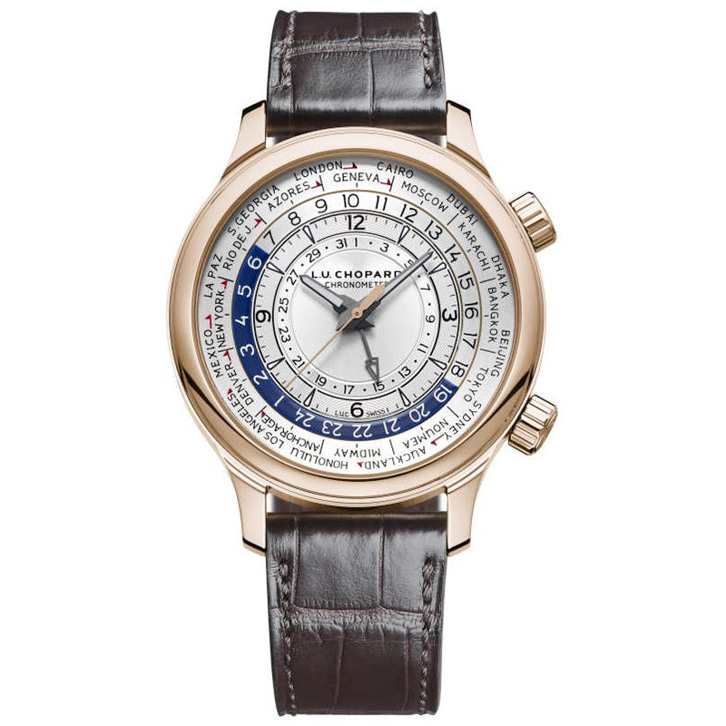 Chopard L.U.C Time Traveler Classic Silver Dial Automatic Mens Watch 161942-5001. 18kt rose gold case and brown alligator leather strap. Fixed bezel. silver dial. Minute markers around the outer rim. Automatic movement. Scratch resistant sapphire crystal. Screw down crown.