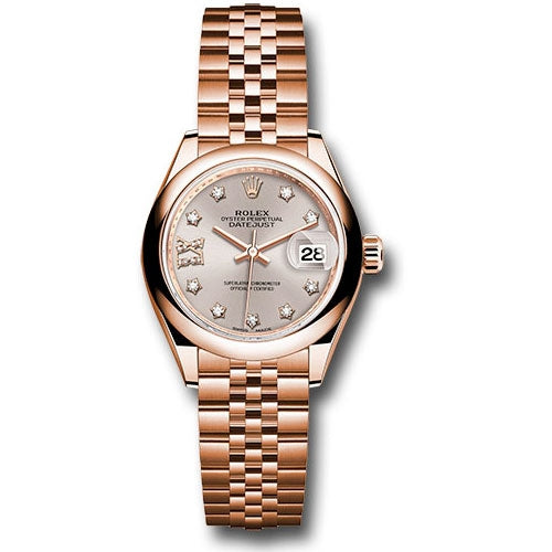 Rolex 279165 s9dix8dj Datejust Lady 28 Everose Gold, Domed Bezel, Jubilee Bracelet. 28mm 18K Everose gold oyster case, screw-down crown with twinlock double waterproofness system, domed bezel, scratch-resistant sapphire crystal with cyclops lens over the date and double anti-reflective coating, silver sundust dial, 9 diamonds set in star shaped hour marker settings and 8 diamond set in Roman numeral IX, Rolex calibre 2236 automatic movement with center hour, minute and seconds hands, instantaneous date with rapid setting, and stop-seconds for precise time setting, 18K Everose gold Jubilee bracelet with five-piece links, concealed folding Crownclasp buckle. Waterproof to 100 meters.