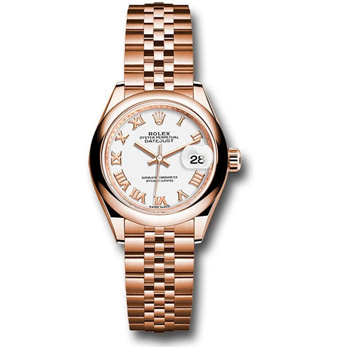 Rolex 279165 wrj Datejust Lady 28 Everose Gold, Domed Bezel, Jubilee Bracelet. 28mm 18K Everose gold oyster case, screw-down crown with twinlock double waterproofness system, domed bezel, scratch-resistant sapphire crystal with cyclops lens over the date and double anti-reflective coating, white dial, Roman numerals, Rolex calibre 2236 automatic movement with center hour, minute and seconds hands, instantaneous date with rapid setting, and stop-seconds for precise time setting, 18K Everose gold Jubilee bracelet with five-piece links, concealed folding Crownclasp buckle. Waterproof to 100 meters.