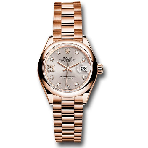 Rolex 279165 s9dix8dp Lady Datejust 28mm Watch, Domed Bezel, President. 28mm 18K Everose gold oyster case, screw-down crown with twinlock double waterproofness system, domed bezel, scratch-resistant sapphire crystal with cyclops lens over the date and double anti-reflective coating, silver sundust dial, 9 diamonds set in star shaped hour marker settings and 8 diamond set in Roman numeral IX, Rolex calibre 2236 automatic movement with center hour, minute and seconds hands, instantaneous date with rapid setting, and stop-seconds for precise time setting, 18K Everose gold President bracelet with semi-circular three-piece links, concealed folding Crownclasp buckle. Waterproof to 100 meters.