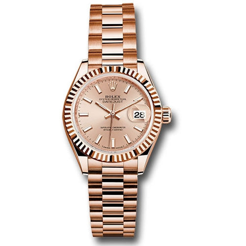 Rolex 279175 pip Rose Gold Lady Datejust 28mm Watch, Fluted Bezel. 28mm 18K Everose gold oyster case, screw-down crown with twinlock double waterproofness system, fluted bezel, scratch-resistant sapphire crystal with cyclops lens over the date and double anti-reflective coating, pink sundust dial, index hour markers with Chromalight, Rolex calibre 2236 automatic movement with center hour, minute and seconds hands, instantaneous date with rapid setting, and stop-seconds for precise time setting, 18K Everose gold President bracelet with semi-circular three-piece links, concealed folding Crownclasp buckle. Waterproof to 100 meters.
