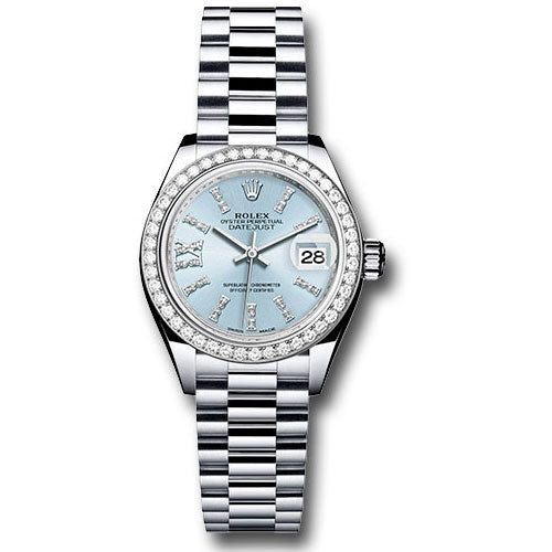 Rolex 279136RBR ib36dix8dp Platinum Lady Datejust 28mm Watch, President Bracelet. 28mm platinum case, screw-down crown with twinlock double waterproofness system, domed bezel set with 44 diamonds, scratch-resistant sapphire crystal with cyclops lens over the date and double anti-reflective coating, ice blue dial, 36 diamonds set in index hour markers and 8 diamond set in Roman numeral IX, Rolex calibre 2236 automatic movement with center hour, minute and seconds hands, instantaneous date with rapid setting, and stop-seconds for precise time setting, platinum President bracelet with semi-circular three-piece links, concealed folding Crownclasp buckle. Waterproof to 100 meters.