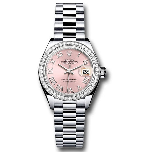 Rolex 279136RBR prp Platinum Lady Datejust 28mm Watch, President Bracelet. 28mm platinum case, screw-down crown with twinlock double waterproofness system, bezel set with 44 diamonds, scratch-resistant sapphire crystal with cyclops lens over the date, pink dial, Roman numerals, Rolex calibre 2236 automatic movement with center hour, minute and seconds hands, instantaneous date with rapid setting, and stop-seconds for precise time setting, approximately 55 hours of power reserve, platinum President bracelet with semi-circular three-piece links, concealed folding Crownclasp buckle. Waterproof to 100 meters.