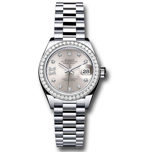 Rolex 279136RBR s9dix8dp Platinum Lady Datejust 28mm Watch, President Bracelet. 28mm platinum case, screw-down crown with twinlock double waterproofness system, domed bezel set with 44 diamonds, scratch-resistant sapphire crystal with cyclops lens over the date and double anti-reflective coating, silver dial, 9 diamonds set in star shaped hour marker settings and 8 diamond set in Roman numeral IX, Rolex calibre 2236 automatic movement with center hour, minute and seconds hands, instantaneous date with rapid setting, and stop-seconds for precise time setting, platinum President bracelet with semi-circular three-piece links, concealed folding Crownclasp buckle. Waterproof to 100 meters.