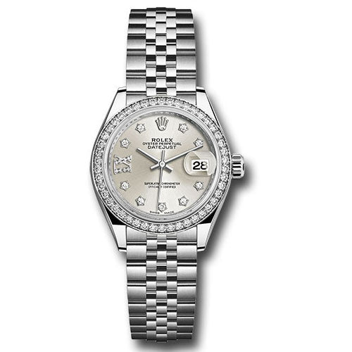 Rolex 279384RBR s9dix8dj Stainless Steel Lady Datejust 28mm Watch. 28mm white Rolesor case comprised of a 904L steel monobloc middle case, screw-down steel back, screw-down crown with twinlock double waterproofness system, 18K white gold fluted bezel set with 44 diamonds, scratch-resistant sapphire crystal with cyclops lens over the date and double anti-reflective coating, silver dial, 9 diamonds set in star shaped hour marker settings and 8 diamond set in Roman numeral IX, Rolex calibre 2236 automatic movement with center hour, minute and seconds hands, instantaneous date with rapid setting, and stop-seconds for precise time setting, stainless steel Jubilee bracelet with five-piece links, concealed folding Crownclasp buckle. Waterproof to 100 meters.