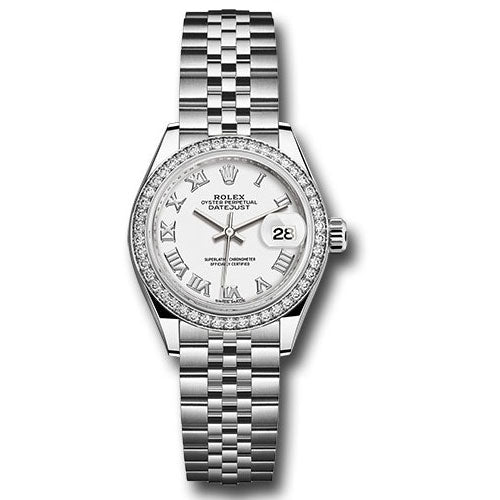 Rolex 279384RBR wrj Stainless Steel Lady Datejust 28mm Watch. 28mm white Rolesor case comprised of a 904L steel monobloc middle case, screw-down steel back, screw-down crown with twinlock double waterproofness system, 18K white gold fluted bezel set with 44 diamonds, scratch-resistant sapphire crystal with cyclops lens over the date and double anti-reflective coating, white dial, Roman numerals, Rolex calibre 2236 automatic movement with center hour, minute and seconds hands, instantaneous date with rapid setting, and stop-seconds for precise time setting, stainless steel Jubilee bracelet with five-piece links, concealed folding Crownclasp buckle. Waterproof to 100 meters.