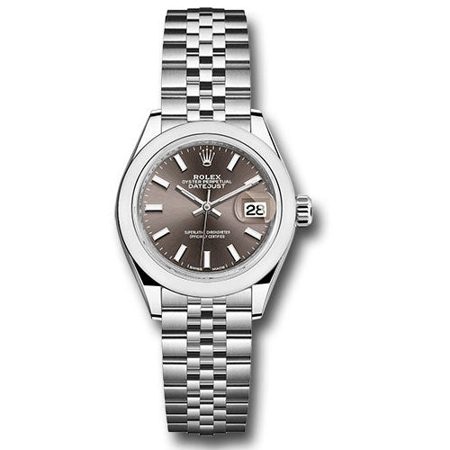 Rolex 279160 dgij Stainless Steel Lady Datejust 28mm Domed Bezel Watch. 28mm 904L stainless steel case, screw-down steel back, screw-down crown with twinlock double waterproofness system, steel domed bezel, scratch-resistant sapphire crystal with cyclops lens over the date and double anti-reflective coating, dark grey dial, index hour markers, Rolex calibre 2236 automatic movement with center hour, minute and seconds hands, instantaneous date with rapid setting, and stop-seconds for precise time setting, stainless steel Jubilee bracelet with five-piece links, concealed folding Crownclasp buckle. Waterproof to 100 meters.