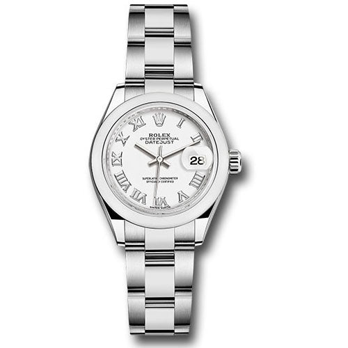 Rolex 279160 wro Lady Datejust Stainless Steel Oyster Bracelet. 28mm 904L stainless steel case, screw-down steel back, screw-down crown with twinlock double waterproofness system, steel domed bezel, scratch-resistant sapphire crystal with cyclops lens over the date and double anti-reflective coating, white dial, Roman numerals, Rolex calibre 2236 automatic movement with center hour, minute and seconds hands, instantaneous date with rapid setting, and stop-seconds for precise time setting, stainless steel Oyster bracelet with flat three-piece links, folding Oysterclasp buckle with Easylink 5mm comfort extension link. Waterproof to 100 meters.