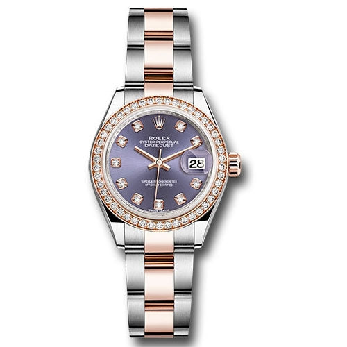 Rolex 279381RBR audo 28mm Everose Rolesor case comprised of a 904L steel monobloc middle case, screw-down steel back, 18K Everose gold screw-down crown with twinlock double waterproofness system, 18K Everose gold diamond bezel, scratch-resistant sapphire crystal with cyclops lens over the date and double anti-reflective coating, aubergine dial, diamond hour markers, Rolex calibre 2236 automatic movement with center hour, minute and seconds hands, instantaneous date with rapid setting, and stop-seconds for precise time setting, Everose Rolesor Oyster bracelet comprised of a combination of 904L steel and 18K Everose gold in flat three-piece links, folding Oysterclasp buckle with Easylink 5mm comfort extension link. Waterproof to 100 meters.