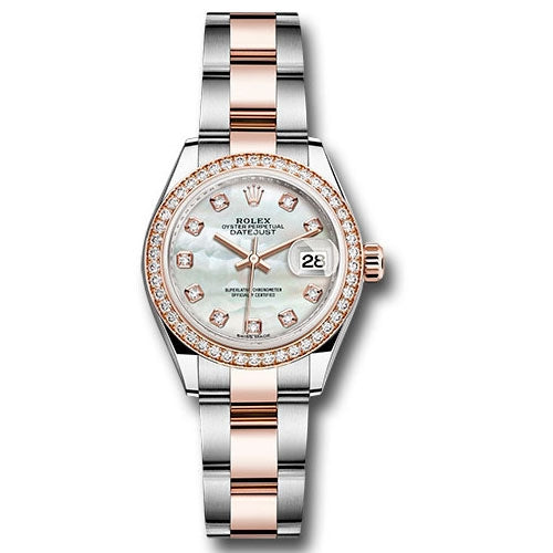 Rolex 279381RBR mdo 28mm Everose Rolesor case comprised of a 904L steel monobloc middle case, screw-down steel back, 18K Everose gold screw-down crown with twinlock double waterproofness system, 18K Everose gold diamond bezel, scratch-resistant sapphire crystal with cyclops lens over the date and double anti-reflective coating, white mother-of-pearl dial, diamond hour markers, Rolex calibre 2236 automatic movement with center hour, minute and seconds hands, instantaneous date with rapid setting, and stop-seconds for precise time setting, Everose Rolesor Oyster bracelet comprised of a combination of 904L steel and 18K Everose gold in flat three-piece links, folding Oysterclasp buckle with Easylink 5mm comfort extension link. Waterproof to 100 meters.