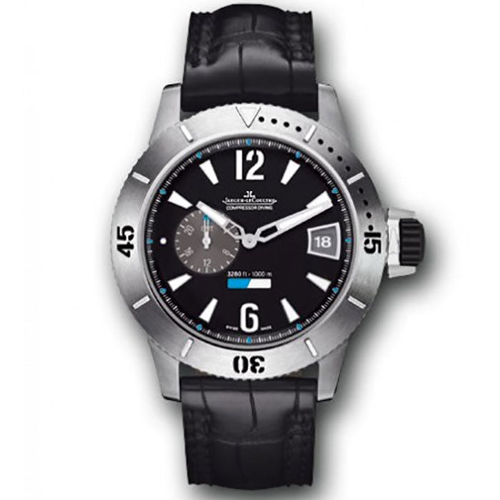 Jaeger LeCoultre Master Compressor Black Dial Automatic Men's Watch Q184T470. Titanium case with a croco leather strap. Unidirectional rotating titanium bezel. Black dial with luminous hands and index hour markers. Minute markers around the outer rim. Dial Type: Analog. Date display at the 3 o'clock position. Automatic movement. Scratch resistant sapphire crystal. Case diameter: 46 mm. Case thickness: 17 mm. Round case shape. Deployment with push button release clasp. Water resistant at 1000m/3300ft. Functions: date, hour, minute, second.
