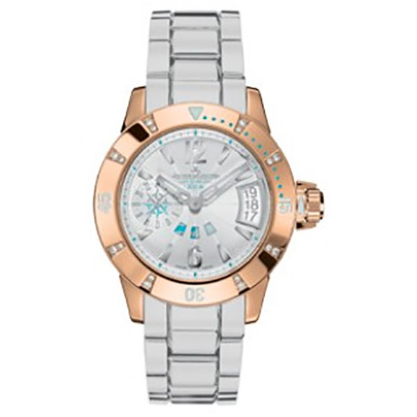 Jaeger LeCoultre Q1892720 Master Compressor Diving GMT Women's Watch. 18kt Rose Gold Case. 38mm Case Dimension. Silver Dial. White Rubber Strap.