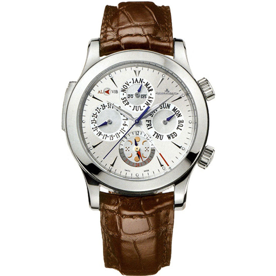 Jaeger LeCoultre Master Date Tourbillon Automatic Mens Watch Q1652410. 18kt rose gold case with a brown alligator leather strap. Fixed-18 carat rose gold bezel. Beige dial with rose gold-tone hands and stick hour markers. Minute markers around the outer rim. Dial Type: Analog. Luminescent hands and markers. Date around an inner circle. Jaeger LeCoultre Calibre 978 automatic movement with about 48 hours of power reserve. Scratch resistant sapphire crystal. Skeleton transparent exhibition see through case back. Case size: 39 mm. Round case shape. Deployment with push button clasp. Water resistant at 50 meters / 165 feet. Functions: date, hour, minute, second, power reserve. Luxury watch.