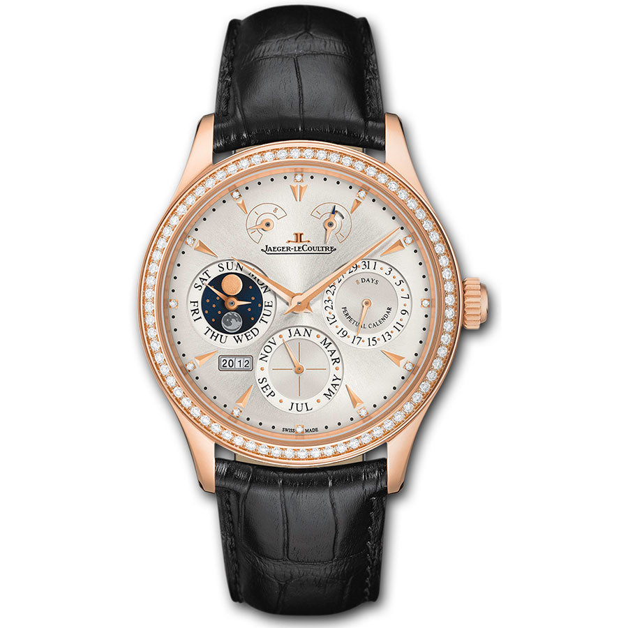Jaeger LeCoultre Master Perpetual Mens Watch Q1612403. 18kt rose gold case with a black alligator leather strap. Fixed- diamond set bezel. Silver dial with rose gold-tone hands and index hour markers. Jaeger LeCoultre Calibre 876-440B hand wind movement with about 8 Days of power reserve. Scratch resistant sapphire crystal. Skeleton transparent exhibition see through case back. Case size: 40 mm. Case thickness: 12.8 mm. Round case shape. Deployment with push button clasp. Water resistant at 50 meters / 165 feet. Functions: hour, minute, second, perpetual calendar, power reserve, day-night indicator, red security zone, year display. Luxury watch style. Watch label: Swiss Made. Item Variations: Q1612403, 1612403, 161.24.03, Q161.24.03.