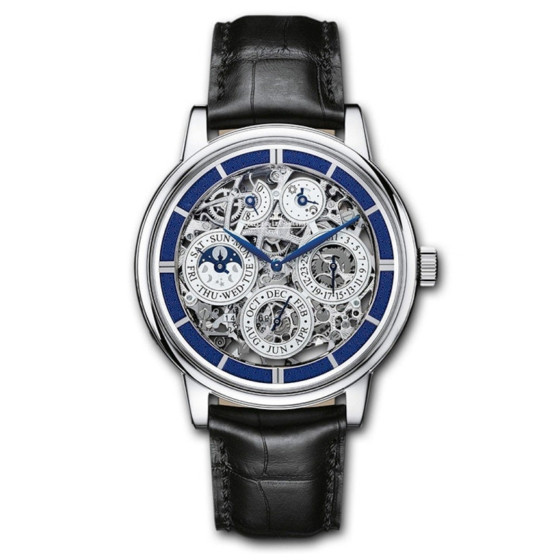 Jaeger LeCoultre Master Grande Tradition Skeleton Dial Mens Watch Q50635SQ. 18kt white gold case with a black leather strap. Skeleton dial with blue steel hands. Hand wind movement. Scratch resistant sapphire crystal. Case diameter: 42 mm. Round case shape. Buckle clasp. Water resistant at 50 meters / 165 feet. Item Variations: Q50635SQ, 50635S, 506.35.S, Q506.35.SQ.