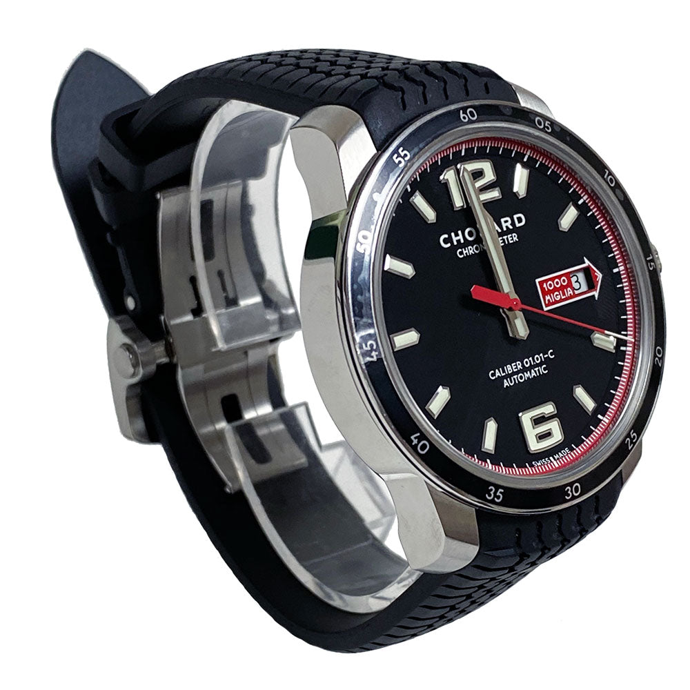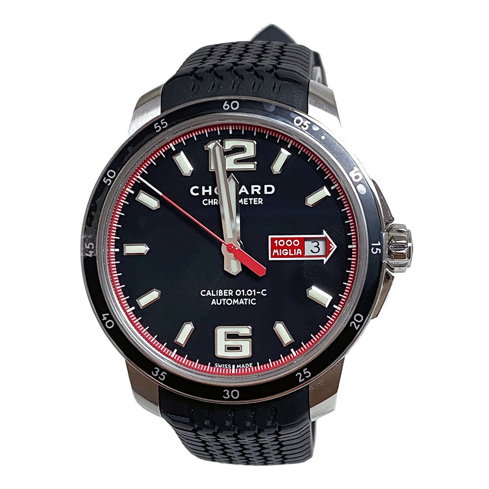 Chopard Mille Miglia GTS Automatic Black Dial Black Rubber Mens Watch 168565-3001. Stainless steel case with a black (tire tread) rubber strap. Fixed stainless steel bezel with a black aluminium inlay. Black dial with luminous hands and index hour markers. Arabic numerals mark the 6 and 12 o'clock positions. Minute markers around the outer rim. Dial Type: Analog. Luminescent hands and markers. Date display at the 3 o'clock position. Automatic movement with a 60-hour power reserve. Scratch resistant sapphire crystal. Screw down crown. See through case back. Case diameter: 43 mm. Case thickness: 11.43 mm. Round case shape. Folding clasp. Water resistant at 100 meters / 330 feet. Functions: date, hour, minute, second. Luxury watch.