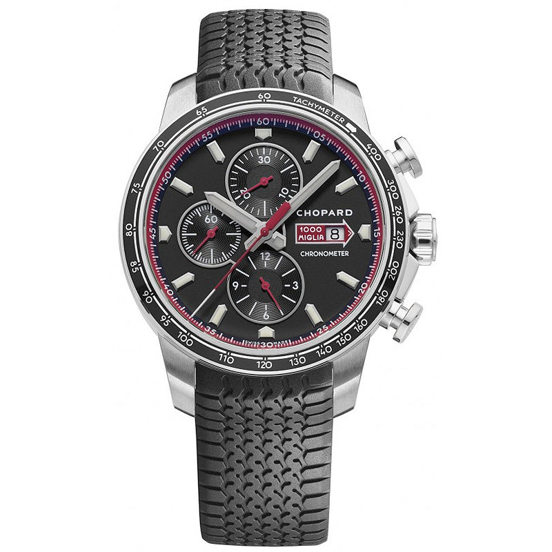 Chopard Mille Miglia GTS Chronograph Black Dial Mens Watch 168571-3001. Stainless steel case with a black (racing tire profile) rubber strap. Fixed stainless steel bezel with a black aluminum inlay showing tachymeter markings. Black dial with luminous silver-tone hands and index hour markers. Minute markers around the outer rim. Automatic movement with a 48-hour power reserve. Scratch resistant sapphire crystal. Screw down crown. Solid case back. Round case shape, case size: 44 mm, case thickness: 11.43 mm. Band width: 20 mm. Tang clasp. Water resistant at 100 meters / 330 feet. Item Variations: 168571 3001, 168571.3001, 1685713001.