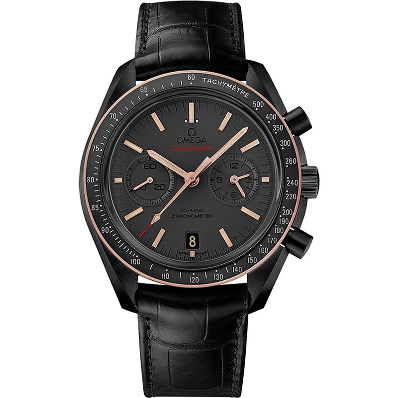 Omega Speedmaster Moonwatch Chronograph Automatic Mens Watch 311.63.44.51.06.001. Black ceramic case with a black alligator leather strap. Fixed 18kt rose gold bezel with a black ceramic top ring showing tachymeter markings. Black dial with luminous rose gold hands and index hour markers. Minute markers around the outer rim. Automatic movement with a 60-hour power reserve. Scratch resistant sapphire crystal. Screw down crown. Transparent case back. Case diameter: 44.25 mm. Case thickness: 16.5 mm. Round case shape. Band width: 22.9 mm. Band length: 9 inches. Fold over clasp. Water resistant at 50 meters / 165 feet.