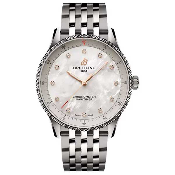 Breitling a77320e61a2a1 32mm ladies Navitimer watch. The polished stainless steel case and bracelet of this watch beautifully complement the white Mother of Pearl dial. The dial features 12 diamond hour markers, along with polished rose gold tone hands, with the hour and minute hands featuring luminous fill. A fine printed minutes/seconds track adds to the elegant design. The watch is powered by the Breitling Quartz Chronometer caliber 77, containing 3 jewels and boasting an approximate battery life of 3-4 years for reliability and accuracy.