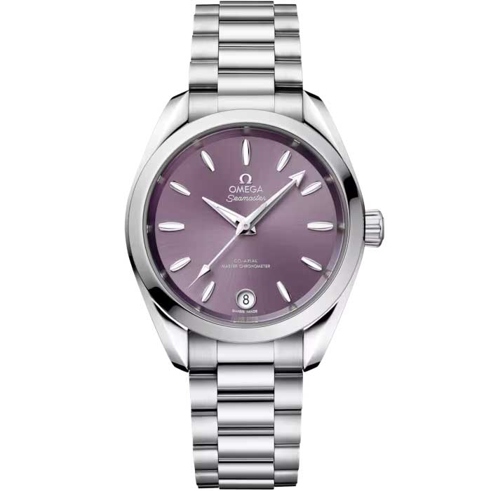 Omega Aqua Terra Men's Watch 220.10.34.20.10.00. Stainless steel case with a stainless steel bracelet. Fixed stainless steel bezel. Purple dial with silver-tone hands and index hour markers. Date display at the 6 o'clock position. Omega calibre 8800 automatic movement, containing 39 Jewels, bitting at 25200 vph, and has a power reserve of approximately 55 hours. Scratch resistant sapphire crystal. Screw down crown. Transparent case back. Round case shape. Case size: 38 mm. Band width: 19 mm. Deployment clasp with a push button release.