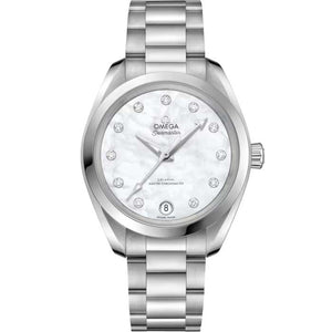Omega Aqua Terra Men's Watch 220.10.34.20.55.001. This elegant watch features a brushed finished stainless steel case complemented by a polished bezel with beveled corners, which frames a stunning mother-of-pearl dial. The face is adorned with 11 diamond hour markers set in polished white gold, alongside steel hands filled with luminescent material for visibility. A date window is conveniently positioned at the 6 o'clock mark. Powering this timepiece is the Omega caliber 8800 movement, which is Master Chronometer certified by both COSC and METAS. It beats at 25,200 vibrations per hour, contains 28 jewels, and offers an approximate power reserve of 55 hours. This movement is anti-magnetic, resilient against magnetic fields exceeding 15,000 gauss, and features Omega's "Si 14" silicon balance spring for enhanced shock resistance. Additionally, the Co-Axial Escapement contributes to greater precision and durability by reducing friction and minimizing the need for lubrication, while the rotor and visible bridges are beautifully finished with a unique "arabesque" wave design.