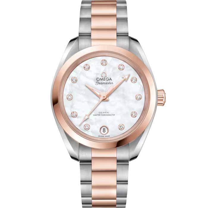 Omega 220.20.34.20.55.001 Aqua Terra 150M Co-Axial Master Chronometer 34mm Ladies Watch. This elegant watch features a brushed finished stainless steel case with a polished 18K Sedna™ gold bezel and beveled corners, showcasing a mother of pearl dial. The dial is adorned with 18K Sedna gold hour markers and hands, both filled with luminous material, and includes a date window conveniently located at the 6 o'clock position. Powering this timepiece is the Omega caliber 8800 movement, which beats at 25,200 vibrations per hour, contains 28 jewels, and offers an impressive power reserve of approximately 55 hours. Its anti-magnetic properties allow it to resist magnetic fields greater than 15,000 gauss, while the "Si 14" silicon balance spring enhances its resistance to shock and environmental disturbances, ensuring outstanding chronometric performance. Additionally, the movement features Omega’s Co-Axial Escapement for improved precision, stability, and durability, while the rotor and visible bridges are beautifully finished with a unique "arabesque" wave design.