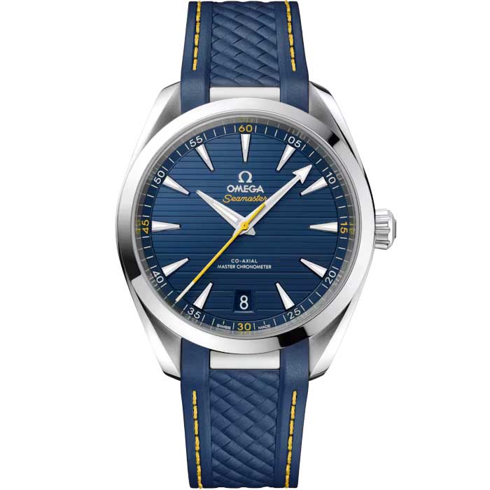 Omega 220.12.41.21.03.009 Aqua Terra 150M Co-Axial Master Chronometer 41mm Mens Watch. This special edition watch, inspired by Swedish pole vaulter Armand “Mondo” Duplantis, showcases a stunning case made from both brushed and polished stainless steel, complemented by a stainless steel crown and a fixed polished bezel. The blue dial features a horizontal teak pattern adorned with yellow accents, enhancing its vibrant aesthetic. Luminous applied markers and hands, along with a central large yellow seconds hand, ensure excellent visibility, while a convenient date window is positioned at the 6 o'clock mark. Powering this remarkable timepiece is the Omega calibre 8900, which operates at 3Hz (21,600 vibrations per hour), contains 39 jewels, and boasts a power reserve of 60 hours (3 days).