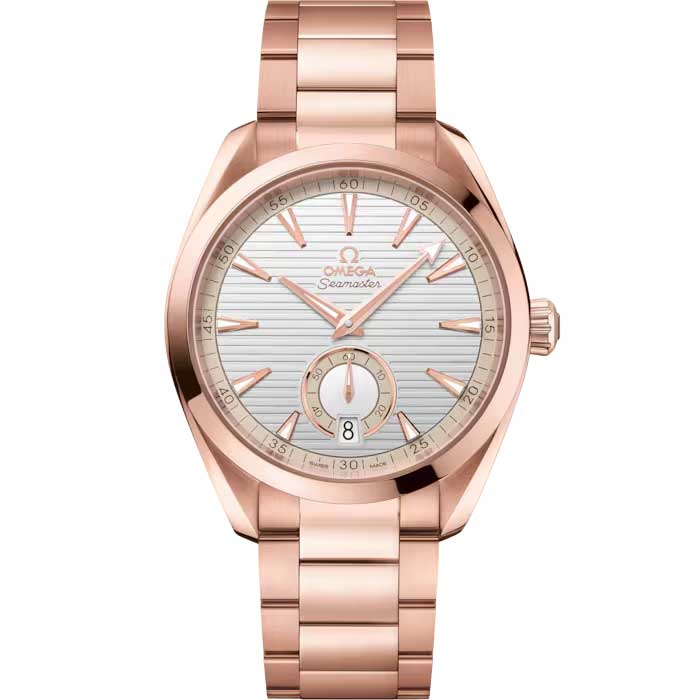 Omega 220.50.41.21.02.002 Aqua Terra 150M Co-Axial Master Chronometer 41mm Mens Watch. This exquisite watch features a brushed and polished 18kt Sedna Gold case, bezel, and bracelet, showcasing a silvery-beige main dial with a horizontal linear teak pattern and elegant beige dial rims. The dial is adorned with faceted hands and applied index hour markers, both of which have luminous fill for enhanced visibility. It also includes fine printed minute and seconds tracks, a small seconds sub-dial at 6 o'clock, and a date window conveniently located at the same position. Powering this timepiece is the Omega caliber 8917 movement, which beats at 25,200 vibrations per hour, contains 38 jewels, and offers an approximate power reserve of 60 hours thanks to its twin barrels. The movement features a solid 18kt Sedna Gold rotor and balance bridge, and is certified as a Master Chronometer by the Swiss Federal Institute of Metrology (METAS), ensuring exceptional water resistance, precision, and magnetic resistance up to 15,000 gauss. Additionally, it incorporates Omega's Si14 silicon balance spring and Co-Axial escapement, while the rotor and visible bridges are beautifully finished with Geneva waves in arabesque, enhancing the watch's luxurious appeal.