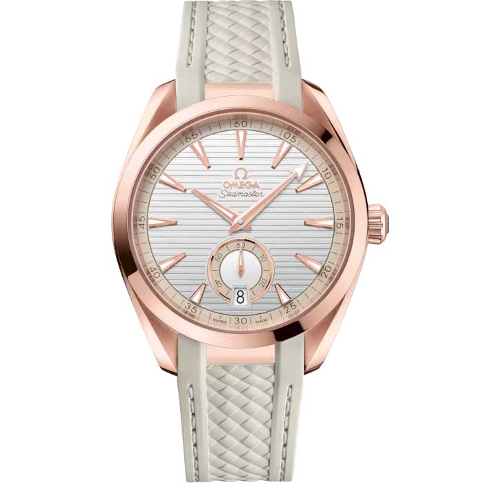 Omega 220.52.41.21.02.001 Aqua Terra 150M Co-Axial Master Chronometer 41mm Mens Watch. This exquisite watch boasts a brushed and polished 18kt Sedna Gold case and bezel, creating a luxurious yet sturdy design. The striking silver main dial features a graceful horizontal linear teak pattern, enhanced by silver dial rims and adorned with faceted hands filled with luminous material for improved visibility. Applied faceted index hour markers, also filled with luminescence, add to the watch's elegance. The dial includes finely printed minute and seconds tracks, a small seconds sub-dial at 6 o'clock, and a date window conveniently located at the same position. Powering this timepiece is the Omega caliber 8917 movement, which beats at 25,200 vibrations per hour and contains 38 jewels, boasting an impressive power reserve of approximately 60 hours thanks to its twin barrels. The movement features a solid 18kt Sedna Gold rotor and balance bridge, and is certified as a Master Chronometer by the Swiss Federal Institute of Metrology (METAS), ensuring top-notch water resistance, precision, and magnetic resistance up to 15,000 gauss. Additionally, it includes Omega's Si14 silicon balance spring and Co-Axial escapement, which enhance its performance and durability, while the rotor and visible bridges are beautifully decorated with Geneva waves in arabesque, adding to the overall sophistication of the watch.