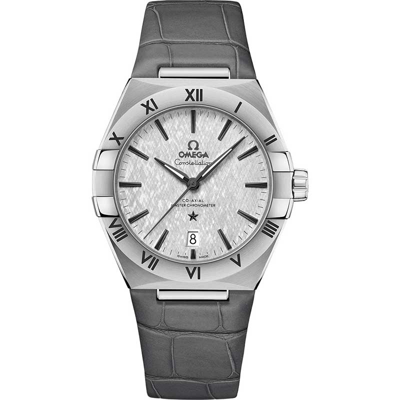 Omega 131.13.39.20.06.001 Men's Constellation Co-Axial Automatic 38mm Watch. This elegant watch features a durable stainless steel case, complemented by a brushed bezel adorned with blackened Roman numerals that add a sophisticated touch. The rhodium grey dial enhances its refined appearance and is accented by blackened index hour markers for a modern contrast. A date display is conveniently positioned at the 6 o'clock mark for practicality. Powering this timepiece is the Omega Caliber 8800 movement, which operates at 25,200 vibrations per hour, contains 39 jewels, and provides an impressive approximate power reserve of 55 hours, ensuring both style and reliable performance for discerning watch enthusiasts.