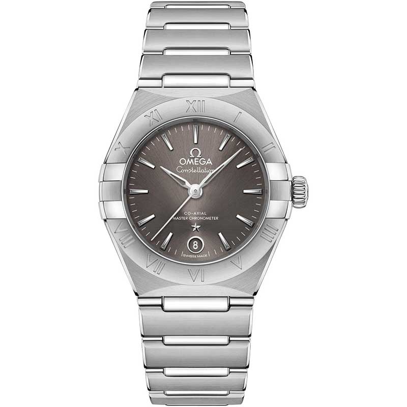 Omega Constellation Co-Axial Master Chronometer 29mm Ladies 131.10.29.20.06.001. This elegant watch features a stainless steel case and bracelet, showcasing a bezel engraved with Roman numerals that adds a classic touch to its sophisticated design. The gray dial is adorned with applied index hour markers for clear readability, and a convenient date display is positioned at the 6 o'clock mark. Powering this timepiece is the Omega Caliber 8700 movement, which beats at 25,200 vibrations per hour and is certified as a Master Chronometer by METAS, ensuring exceptional standards of precision and performance. Additionally, it is resistant to magnetic fields of up to 15,000 gauss and offers an approximate power reserve of 50 hours, making it a reliable choice for any discerning watch enthusiast.