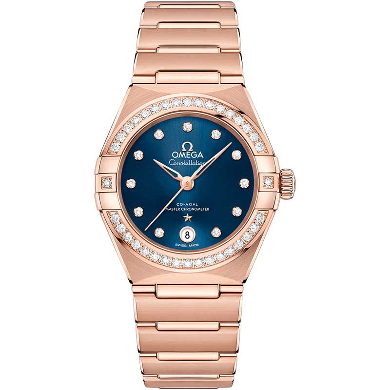 Omega Constellation Co-Axial Master Chronometer 29mm Ladies 131.55.29.20.53.001. This luxurious watch features a stunning 18kt Sedna gold case and bracelet, perfectly paired with a diamond-set 18kt Sedna gold bezel that adds a touch of opulence. The elegant blue dial is adorned with 11 sparkling diamond hour markers, enhancing its sophisticated aesthetic. A practical date display is conveniently positioned at the 6 o'clock mark for ease of use. Powered by the Omega Caliber 8700, which beats at 25,200 vibrations per hour, this timepiece is a Certified Master Chronometer approved by METAS. Notably resistant to magnetic fields up to 15,000 gauss, it also boasts an approximate power reserve of 50 hours, making it an exquisite blend of luxury, precision, and durability for discerning watch enthusiasts.