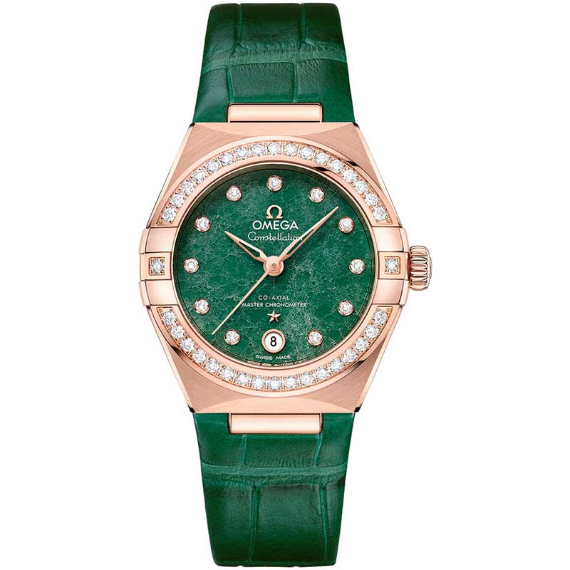 Omega Constellation Co-Axial Master Chronometer 29mm Ladies 131.58.29.20.99.004. This exquisite timepiece features a refined 18kt Sedna gold case that exudes luxury and elegance. The bezel, also crafted from 18kt Sedna gold, is set with dazzling diamonds, adding an extra layer of sophistication. The captivating green aventurine stone dial serves as a striking backdrop, beautifully complemented by 11 diamond hour markers that enhance its opulent appeal. The watch conveniently displays the date at the 6 o'clock position for added functionality. Powered by the Omega Caliber 8701, which beats at 25,200 vibrations per hour, this watch is a Certified Master Chronometer approved by METAS. Additionally, it is highly resistant to magnetic fields reaching up to 15,000 gauss and features an approximate power reserve of 50 hours, making it a perfect blend of style, durability, and precision for discerning watch aficionados.